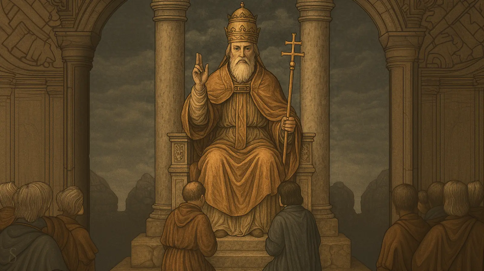 Иерофант, пятый аркан в старших арканах Таро, выступает в роли духовного авторитета и символизирует коллективные ценности. Его изображают как фигуру в церемониальных одеждах, сидящую между колоннами, с двумя последователями у ног, воплощение хранителя знаний.