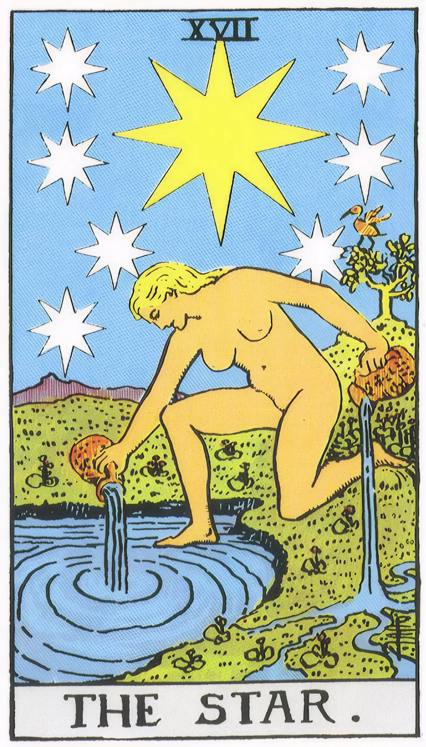 В Аркане XVII, Звезда, ваше внимание неизбежно захватывает обнаженная фигура, переливающая воду из кувшинов. Это гипнотический процесс, и вы, скорее всего, игнорируете фон. Однако отведите взгляд от потока воды и посмотрите направо, вглубь карты. На вершине небольшого дерева (многие исследователи опознают в нем акацию) сидит странная птица.